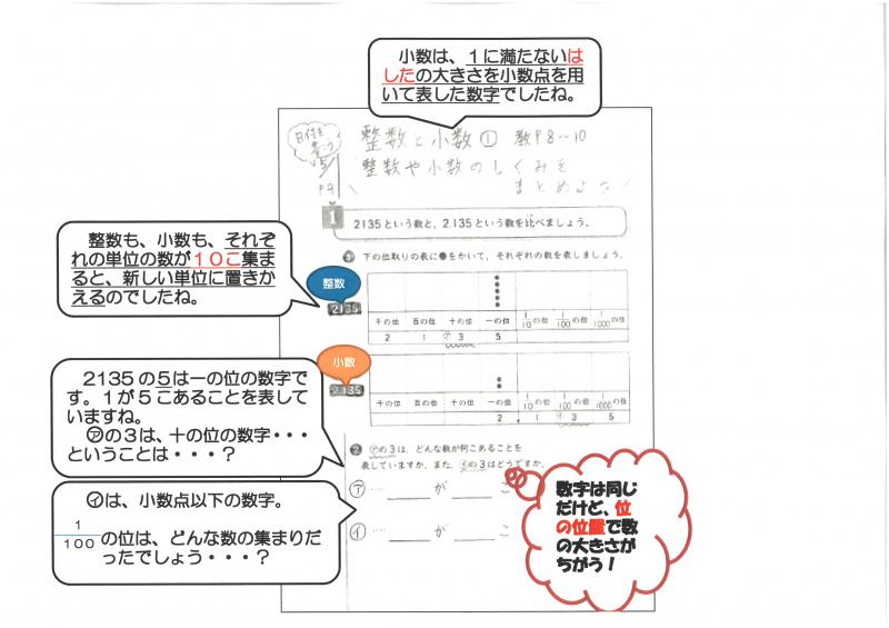 ①375という数について、P8の に入る数を書きましょう(教科書書き込み)。 ②問題2135という数と、2135という数を比べましょう。 →P9①の問題に取り組みましょう(教科書書き込み)。 ③めあて整数や小数のしくみをまとめよう。1 単元名 「小数のわり算を考えよう」 2 指導観 子どもはこれまでの学習において小数のしくみや加減計算,小数が整数と同じ十 進法であることを学習してきている。 具体的には,